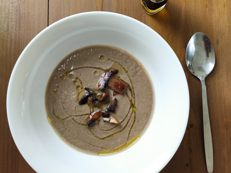 - Add the cream and continue to cook for 2 more minutes, then puree the mixture and add salt and pepper to taste. Once smooth, ladle into bowls and drizzle one tablespoon of Stonebarn Truffle Oil over the soup. Add the sliced sautéed mushrooms for garnish.